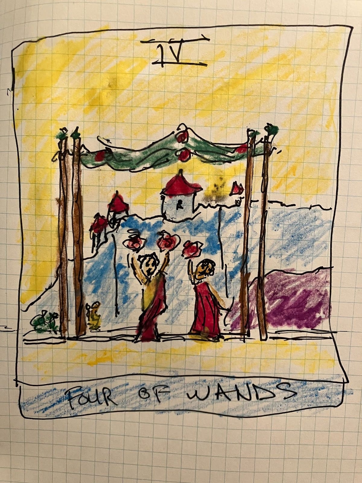 LL: When Lex drew this card in North Carolina it disappeared from my deck in Oregon. Or, maybe I absorbed it. The Four of Wands appears when your creative work begins to flourish and yield results that bloom like the bouquets held aloft by our friends who stand before the fortress, between the upright staves. This is an unfamiliar position for me to be in, and the signs that I need to step back and breathe are plenty. Sometimes when we finally crack a creative code it can quickly become a formula. Formulas are helpful but can also grow tired and stale. From the stability of the fortress we can keep tweaking the formula with new elements.