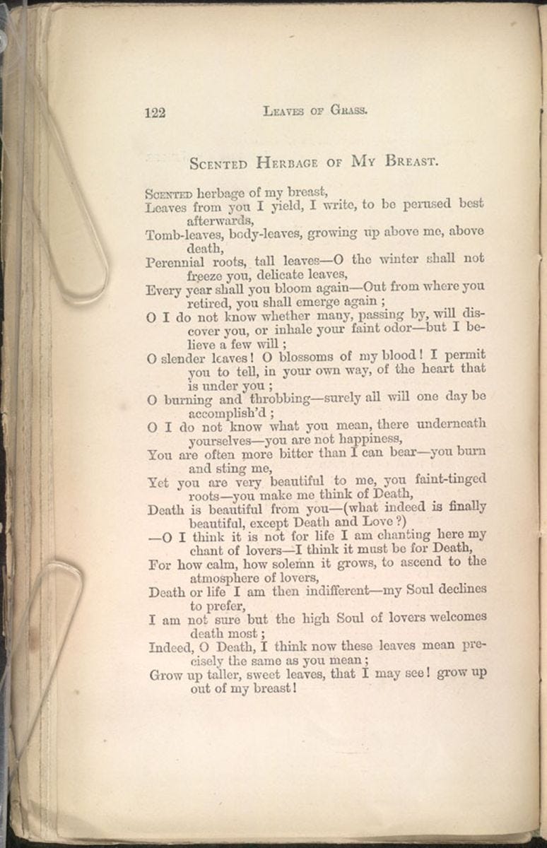Page one of two of “Scented Herbage of my Breast” (second poem in the Calamus series) from the Walt Whitman Archive: