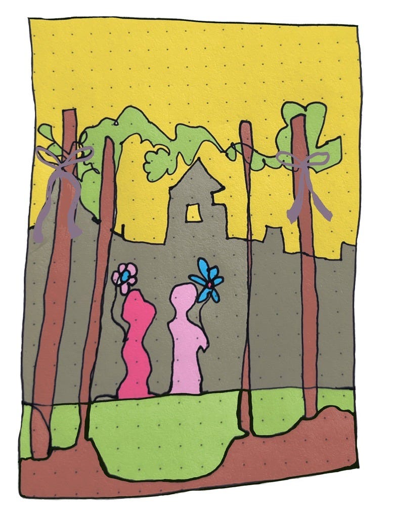 The big gray house in the background and the number four signify a return, through the welcoming arbor, to strong foundations of self and home. A safe place to be. You can always return to that spot when life gets too chaotic and you’ve lost the thread a little.
