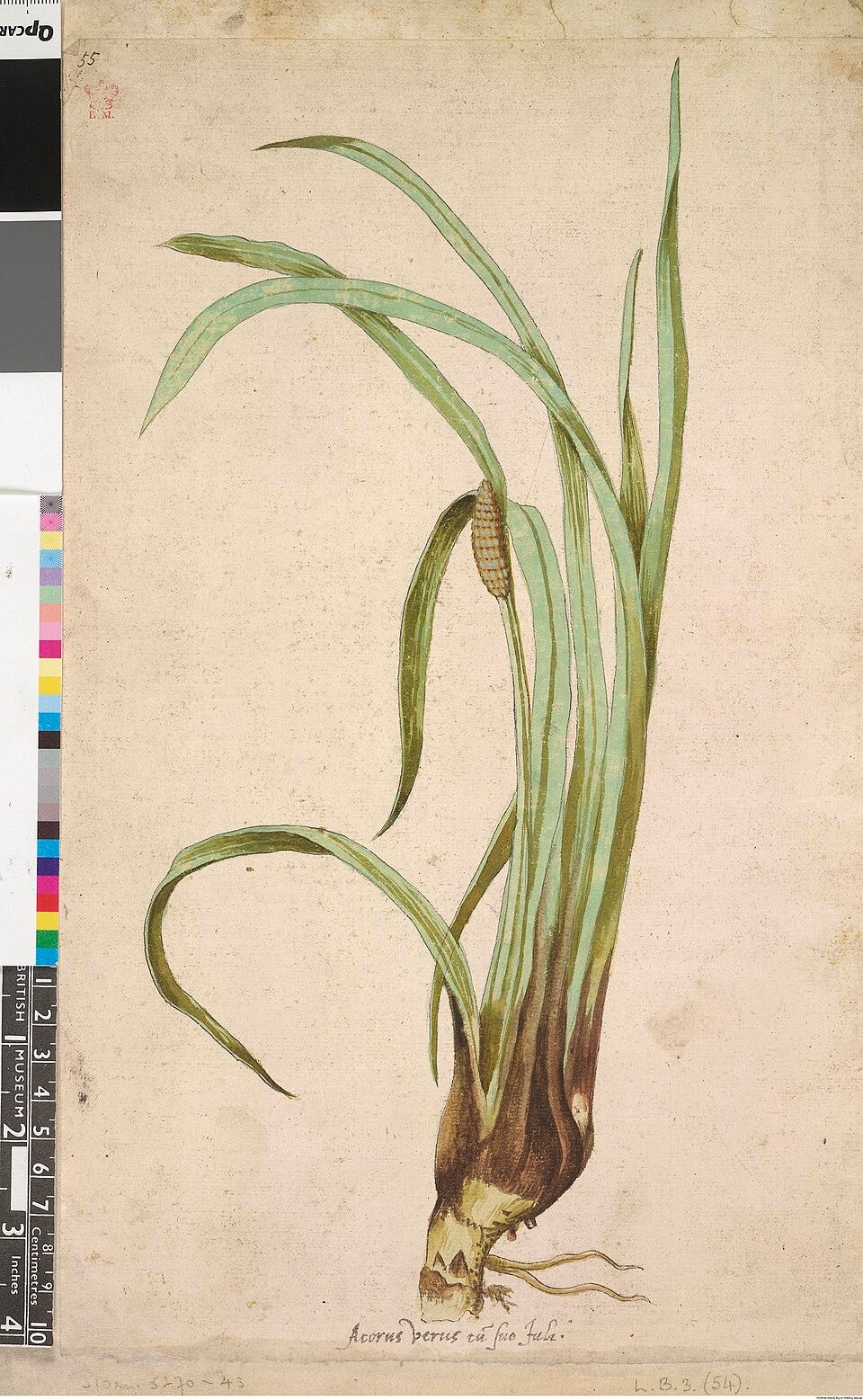 It’s Latin name is Acorus calamus, both epithets from Dioscorides (first century), who talks about two similar plants Acorum and Kalamos.